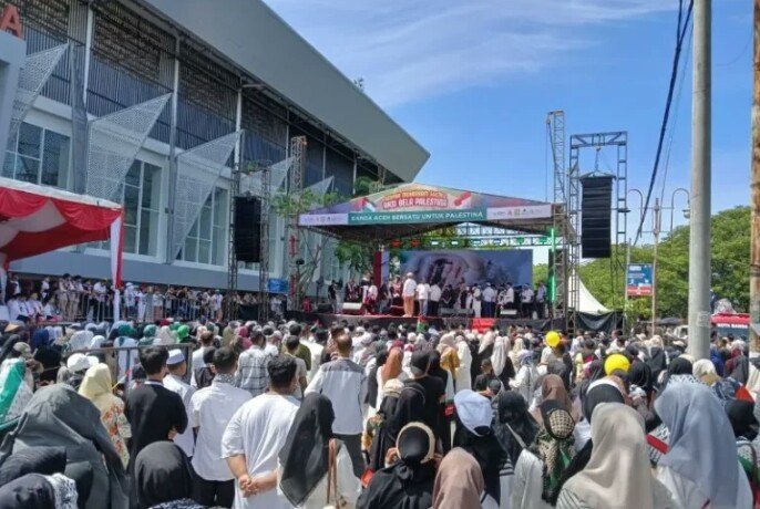 Aksi bela Palestina yang menjadi bagian dari rangkaian kegiatan gebyar Muharram 1447 Hijriah ini turut dimeriahkan penyanyi religi Aunur Rofiq Lil Firdaus alias Opick, berlangsung di depan Stadion H Dimurthala Lampineung Banda Aceh.