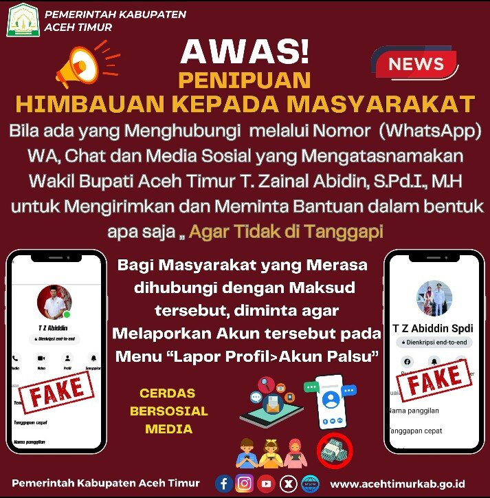Mengingatkan, apabila ada pesan FB dan WhatsApp (WA) yang meminta nomor rekening bank maupun meminta uang dengan mengatasnamakan Wakil Bupati Aceh Timur atau ajudannya, agar tidak ditanggapi. Karena hal itu jelas merupakan aksi penipuan.