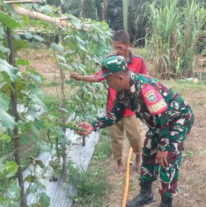 Dalam kegiatan tersebut, Serda Suyetno memberikan pendampingan sekaligus berdiskusi bersama petani mengenai cara merawat tanaman gambas yang baik dan benar. Beberapa hal yang dibahas meliputi teknik penyiraman yang tepat, pemupukan secara berkala, pengendalian hama dan penyakit tanaman, serta pentingnya perawatan lanjaran agar tanaman dapat tumbuh optimal dan menghasilkan buah yang berkualitas.