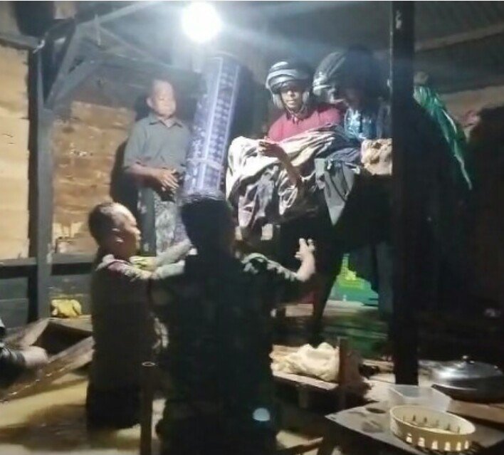 RAJANEWS.Xyz | Aceh Timur – Dalam situasi banjir yang terus meningkat dan mengancam keselamatan warga, personel Koramil 12/Sungai Raya, Kodim 0104/Aceh Timur bersama Polsek Sungai Raya bergerak cepat mengevakuasi masyarakat Desa Bukit Drien ke tempat aman, termasuk seorang nenek Lanjut Usia, yang terjebak di dalam rumahnya, yang akan dievakuasi ke Puskesmas Sungai Raya, pada Selasa (25-11-2025) Malam.