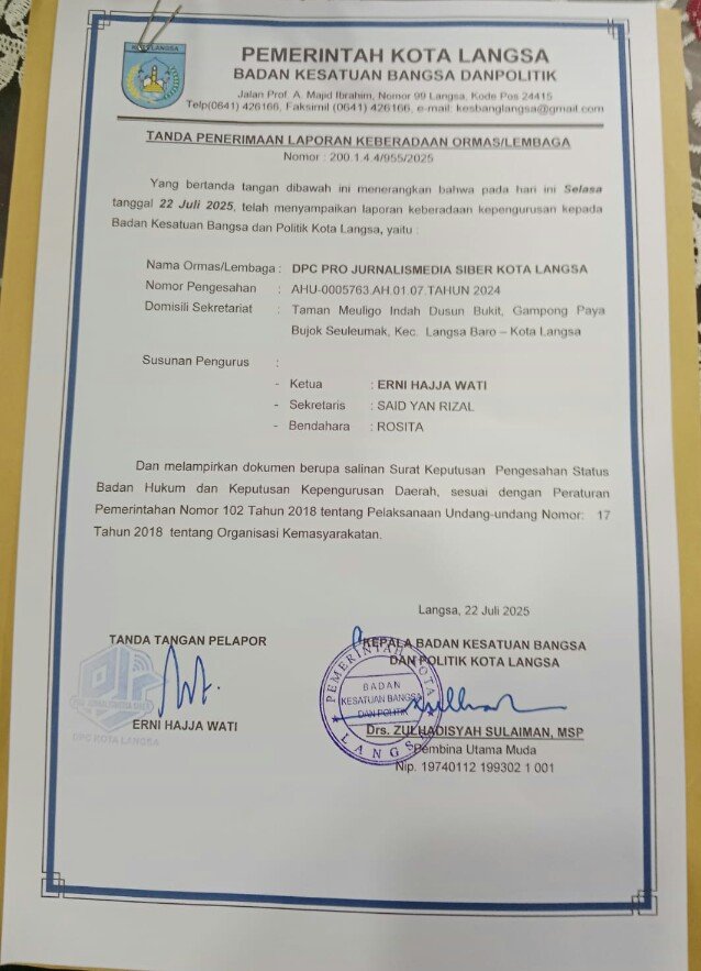 RajaNews.Xyz | Kota Langsa – Dewan Pimpinan Cabang Pro Jurnalismedia Siber (DPC PJS) Kota Langsa ,telah resmi di daftarkan serta sudah mendapatkan Surat Tanda Lapor (SK) oleh Pemerintah Kota Langsa, melalui Badan kesatuan Bangsa dan Politik (Kesbangpol), Kamis (24/07/2025).