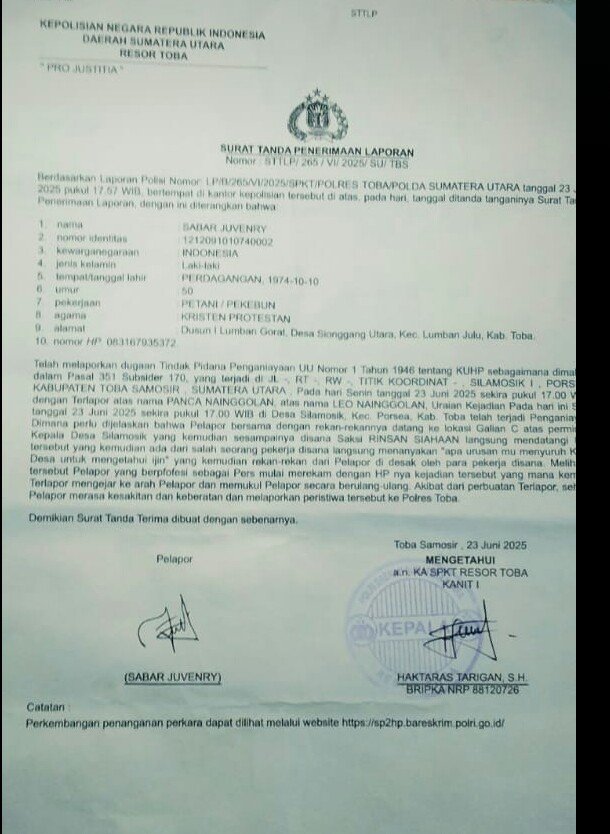Sabar kemudian melapor ke Polres Toba dan laporan diterima dengan nomor: LP/B/265/VI/2025/SPKT/Polres Toba/Polda Sumut, tertanggal 23 Juni 2025 pukul 17.57 WIB.