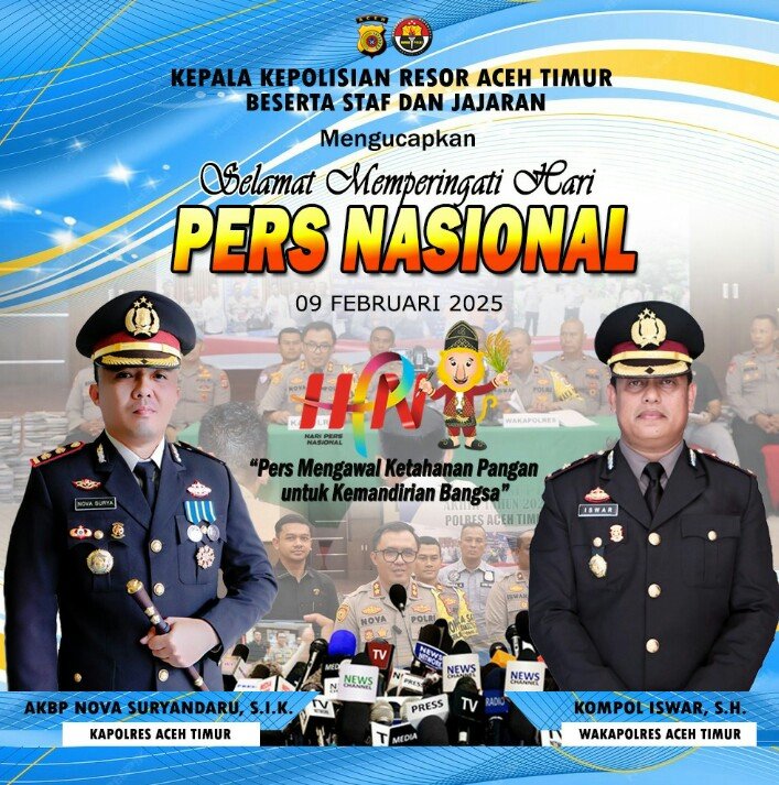 “Sekali lagi, kami segenap keluarga besar Polres Aceh Timur mengucapkan Selamat Hari Pers Nasional 2025. Semoga pers di Aceh Timur terus berfungsi sebagai mata, telinga, dan suara bagi publik, mengedepankan kebenaran dan objektivitas. Bersama, kita bangun Indonesia yang semakin maju dan beradab. Salam hormat,” tutur Kapolres Aceh Timur AKBP Nova Suryandaru, S.I.K.