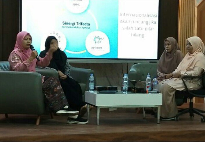Sementara itu, Chery Julida menjelaskan bahwa BIPA berperan penting dalam memperkenalkan bahasa, budaya, dan khazanah keilmuan Aceh serta Indonesia kepada mahasiswa asing melalui pendekatan akademik dan intelektual. Adapun Fadhilah membahas BIPA dan internasionalisasi kampus sebagai peluang, tantangan, serta strategi yang perlu dikelola secara berkelanjutan.
