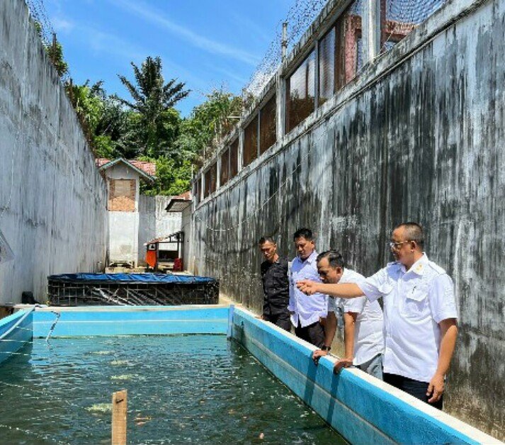 RajaNews.Xyz | Aceh Timur – Kepala Lapas Kelas IIB Idi, Bahtiar Sitepu dengan didampingi Kasi Binadik Giatja, T. Dermawan dan Ka. KPLP, Arif Budiman melakukan Pengontrolan dan Pengecekan ternak ikan lele dan ikan nila di Area Ketahanan Pangan Brandgang Lapas Idi sekaligus melakukan Pengontrolan Keamanan di Area Brandgang Lapas Idi, Rabu (11/06/2025).