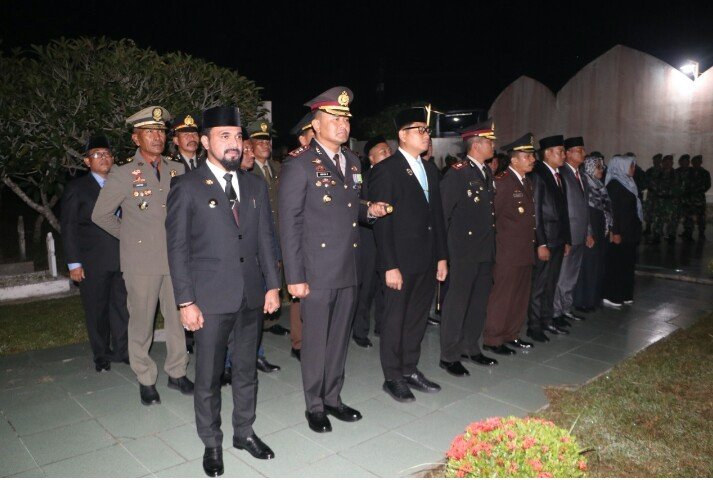 RajaNews.Xyz | Kota Langsa – Kepala Kepolisian Resort Aceh Timur, Polda Aceh, AKBP Irwan Kurniadi, S.I.K., bersama unsur Forkopimda Kabupaten Aceh Timur dan Forkopimda Kota Langsa menghadiri Apel Kehormatan dan Renungan Suci dalam rangka memperingati Hari Ulang Tahun (HUT) Ke-80 Kemerdekaan Republik Indonesia. Kegiatan ini berlangsung khidmat di Taman Makam Pahlawan (TMP) Kota Langsa, Sabtu malam (16/08/2025).