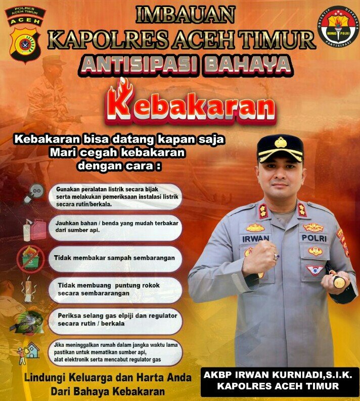 ‘’Pastikan tidak ada sumber api yang masih menyala saat akan pergi meninggalkan rumah,’’ jelas Kapolres Aceh Timur AKBP Irwan kurniadi, S.I.K.
