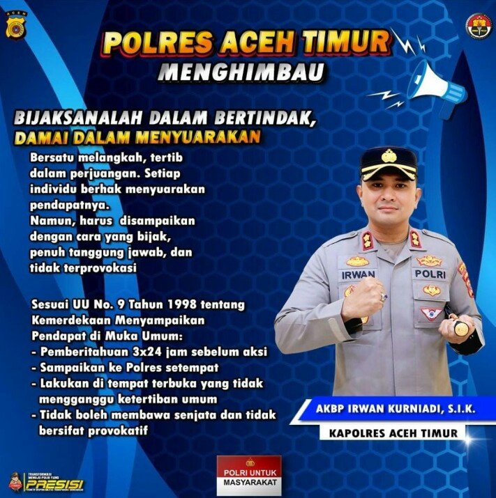 “Kami mengajak seluruh warga Kabupaten Aceh Timur agar tidak terbawa isu yang menyesatkan maupun ajakan yang bersifat menghasut,” ujar Kapolres Minggu (31/08/2025).