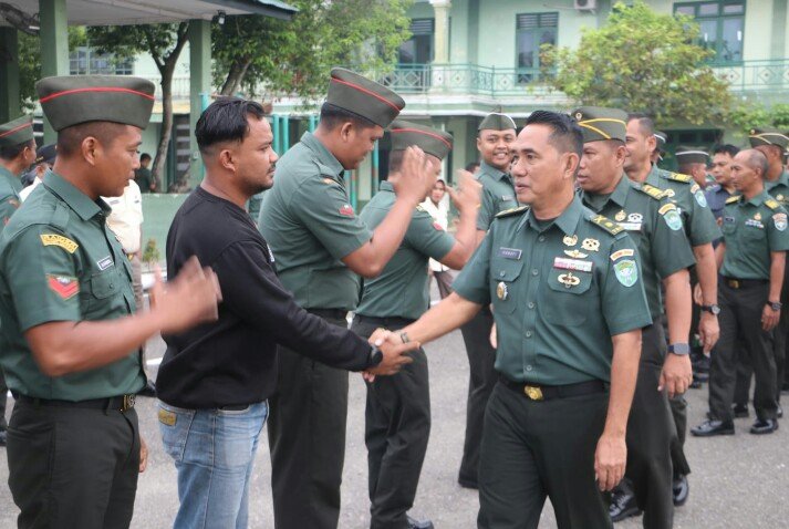 RajaNews.Xyz | Kota Langsa – Komando Distrik Militer (Kodim) 0104/Aceh Timur menggelar apel kembali dari cuti lebaran gelombang II yang dipimpin langsung oleh Kepala Staf Kodim (Kasdim) 0104/Atim, Mayor Inf Hanapi, di lapangan hitam Makodim 0104/Atim, Jl. Jenderal Ahmad Yani, Desa Paya Bujok Seuleumak, Kecamatan Langsa Baroe, Kota Langsa, Selasa (08/04//2025) pagi.