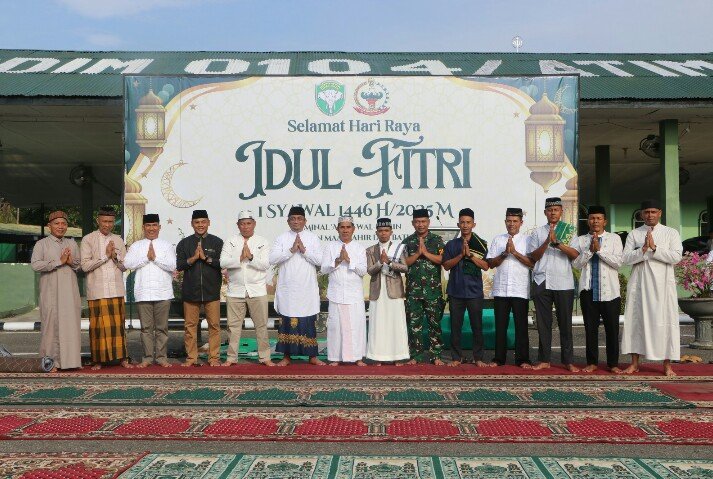 RajaNews.Xyz | Langsa, Senin (31 Maret 2025) – Udara pagi yang sejuk menyelimuti Makodim 0104/Aceh Timur di Gampong Paya Bujok Seuleumak, Kecamatan Langsa Baro, Kota Langsa. Gema takbir yang dipimpin oleh Tgk. Saiful menggema penuh khidmat, mengawali rangkaian Sholat Idul Fitri dan Halal Bi Halal Tahun 1446 H/2025 M yang dihadiri sekitar 300 jamaah.