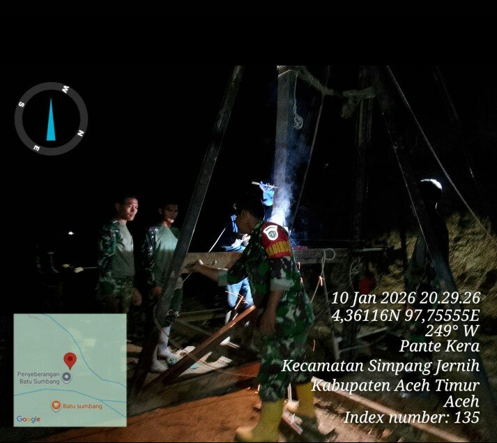 Danramil 10/Simpang Jernih, Kapten Inf Edi Chandra, menjelaskan bahwa jembatan gantung ini menghubungkan Desa Batu Sumbang dengan Desa Pante Kera, Kecamatan Simpang Jernih, Kabupaten Aceh Timur. Menurutnya, pengerjaan pada malam hari dilakukan untuk memaksimalkan waktu serta mempercepat pemulihan mobilitas warga.