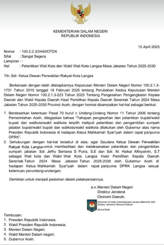 Dalam surat Edaran Kementerian Dalam Negeri Republik Indonesia telah mengeluarkan surat bernomor, 100.2.2.3/2440/OTDA tanggal 15 April 2025, mengenai pelantikan Wali Kota dan Wakil Wali Kota Langsa masa jabatan tahun 2025-2030. Berdasarkan Keputusan Menteri Dalam Negeri Nomor 100.2.1.3-1731 Tahun 2025 tentang Perubahan Kedua Keputusan Menteri Dalam Negeri Nomor 100.2.1.3-223 Tahun 2025, Jeffry Sentana S Putra, S.E dan M. Haikal Alfisyahrin, S.T akan dilantik sebagai Wali Kota dan Wakil Wali Kota Langsa.