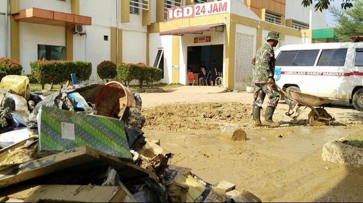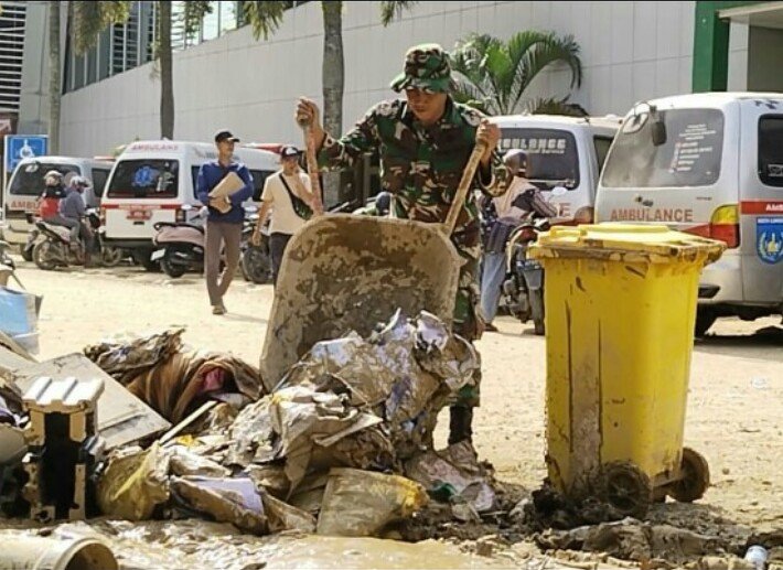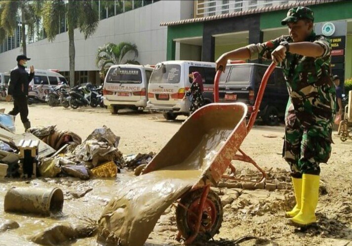 Puluhan personel TNI dari Kodim 0104/Atim dan Yonif TP 853/BRB bersama pihak rumah sakit, relawan, serta masyarakat setempat bahu-membahu membersihkan lumpur, sampah, dan sisa material banjir yang mengganggu aktivitas pelayanan kesehatan. Fokus utama pembersihan meliputi area instalasi rawat inap, halaman rumah sakit, serta jalur akses bagi pasien dan tenaga kesehatan.