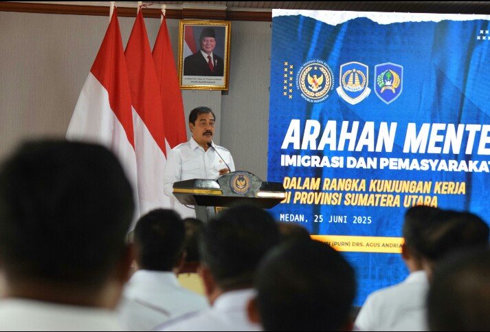 RajaNews.Xyz | Medan – Menteri Imigrasi dan Pemasyarakatan (Imipas) Republik Indonesia, Agus Andrianto, melakukan kunjungan kerja ke Provinsi Sumatera Utara sekaligus memberikan Arahan kepada jajaran Imigrasi dan Pemasyarakatan Sumatera Utara yang dilaksanakan di Aula Lembaga Pemasyarakatan Kelas I Medan, pada Rabu (25/06).