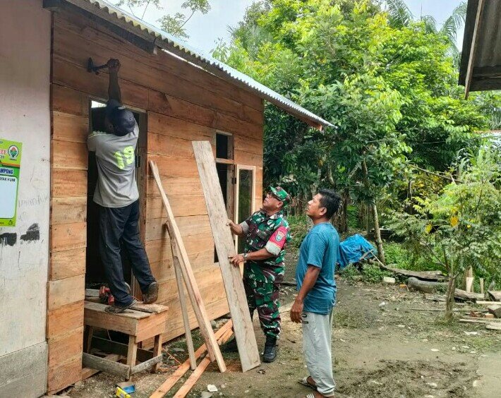RAJANEWS.XYZ | Aceh Timur – Serma Tri Mulyadi, Babinsa d ari Koramil 20 Pante Bidari Kodim 0104/Aceh Timur, turut serta dalam kegiatan pembangunan rumah tidak layak huni yang tengah direhab di Desa Paya Demam Lhe, Kecamatan Pante Bidari, Aceh Timur. Rumah milik Pak Supardi, salah satu warga setempat, sedang mendapatkan sentuhan perbaikan agar dapat dihuni dengan layak, dengan sumber pendanaan berasal dari Dana Desa (DD) tahun 2024. (08/01/2025)