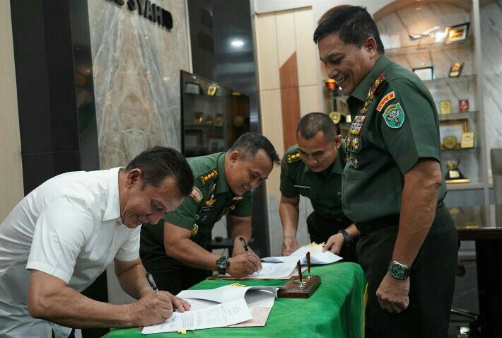 RajaNews.Xyz | Banda Aceh – Panglima Komando Daerah Militer Iskandar Muda (Pangdam IM), Mayjen TNI Niko Fahrizal, M.Tr.(Han)., menyaksikan penandatanganan Perjanjian Kerja Sama Teknis antara Kodam IM dan PTPN IV Regional VI. Kesepakatan ini ditandatangani oleh Asisten Teritorial Kasdam IM, Kolonel Inf Fransisco, S.E., M.I.Kom., dan Region Head PTPN IV Regional VI, Sayahriadi Siregar, dalam sebuah acara yang berlangsung di ruang kerja Pangdam IM, Selasa (12/2/2025).