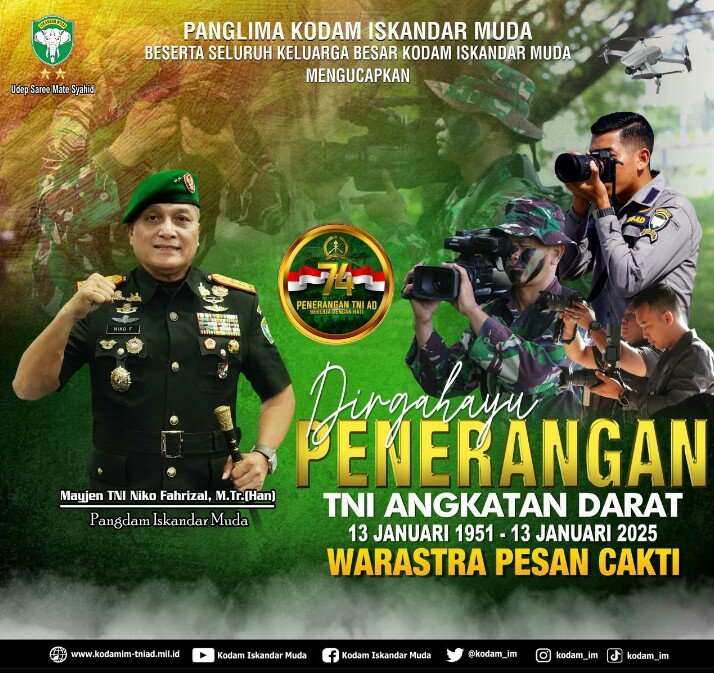 RAJANEWS.XYZ | Banda Aceh – Panglima Komando Daerah Militer Iskandar Muda (Pangdam IM), Mayor Jenderal TNI Niko Fahrizal, M.Tr. (Han), menyampaikan ucapan selamat Hari Ulang Tahun (HUT) ke-74 Dinas Penerangan Angkatan Darat (Dispenad) yang jatuh pada Senin (13/1/2025). Dalam momentum ini, Pangdam IM memberikan apresiasi atas dedikasi Dispenad dalam mendukung tugas-tugas TNI Angkatan Darat melalui penyebarluasan informasi kepada masyarakat.