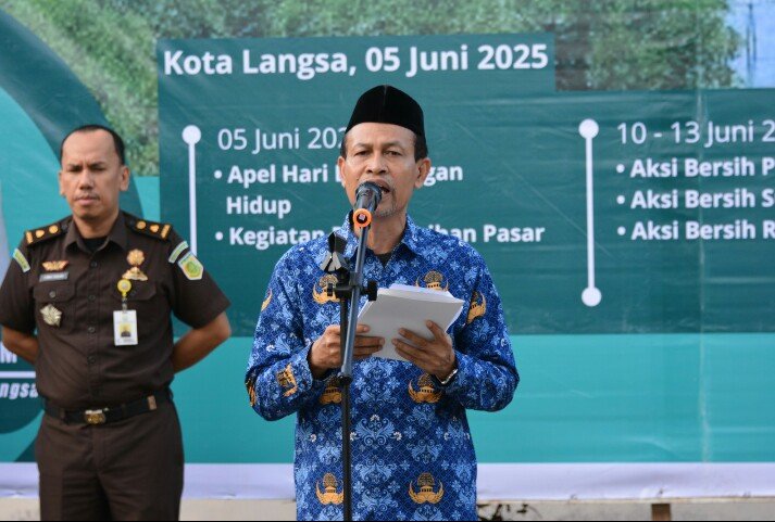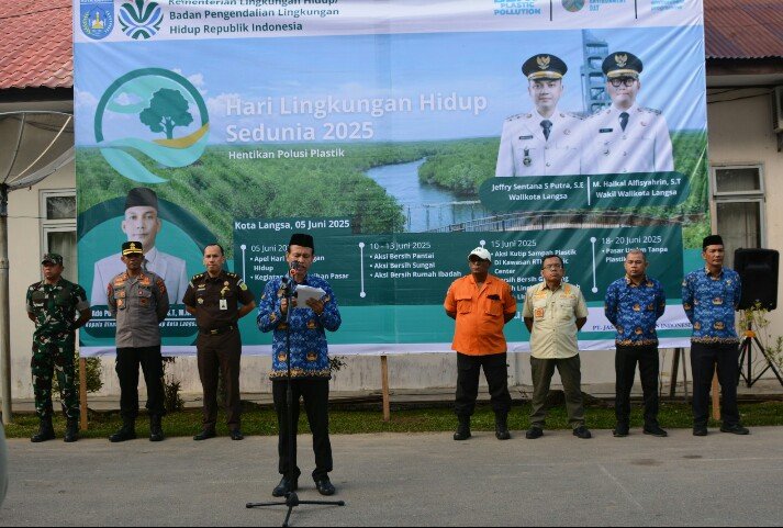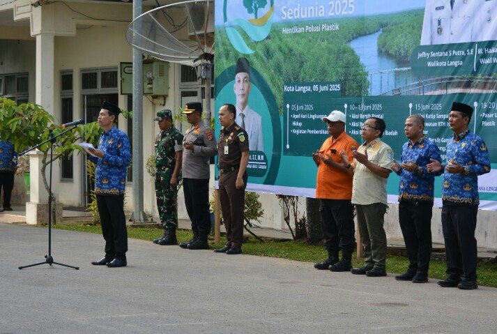 Wali Kota Langsa Jeffry Sentana S Putra, SE, diwakili Asisten II Bidang Perekonomian dan Pembangunan Ali Musafah, SE, memimpin Apel peringatan Hari Lingkungan Hidup Sedunia Tahun 2025 di Halaman Kantor Dinas Lingkungan Hidup Kota Langsa.