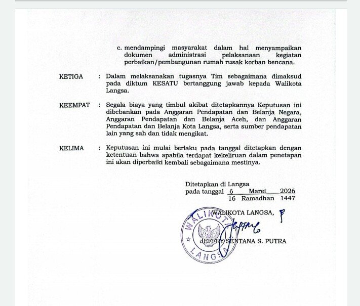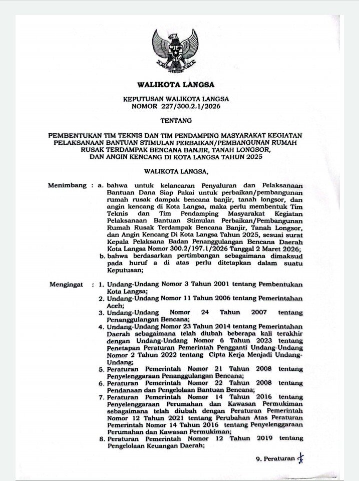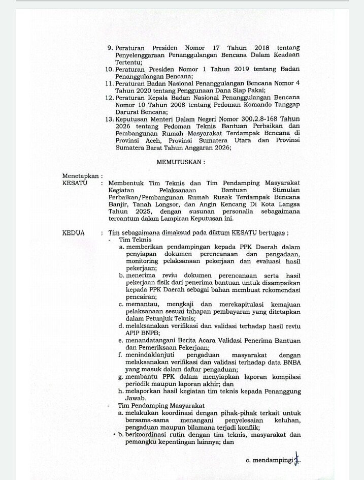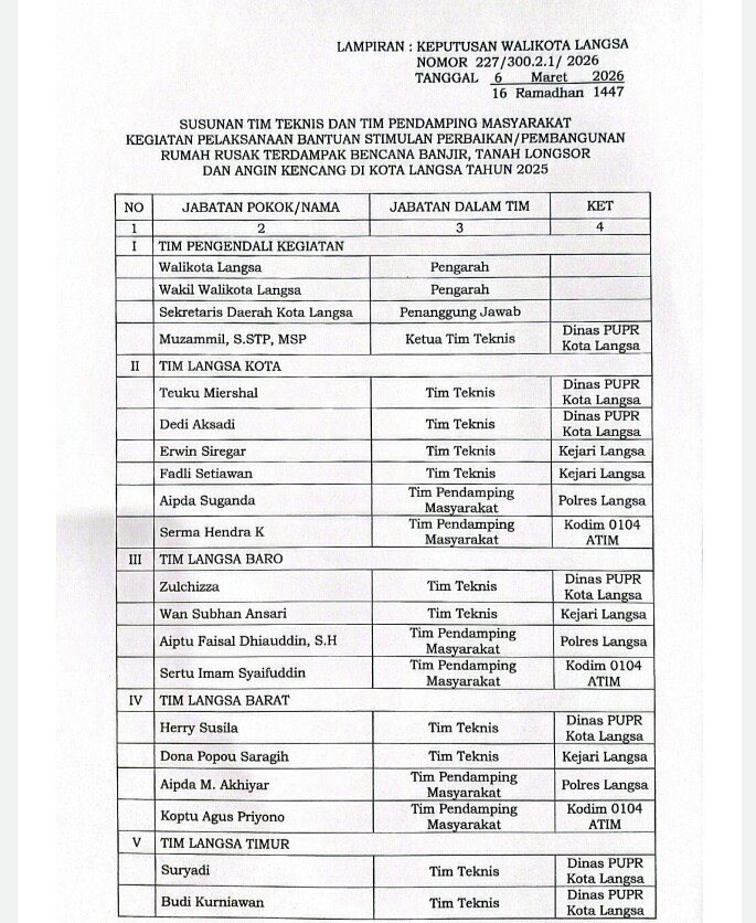 “Perlu kami sampaikan kepada masyarakat Juknis Keputusan Wali Kota Langsa Nomor 226/300.2.1/2026 tentang Petunjuk Teknis Bantuan Perbaikan dan Pembangunan Rumah Masyarakat Terdampak Bencana Banjir, Tanah Longsor dan Angin Kencang di Kota Langsa Tahun Anggaran 2026, yang ditetapkan pada 6 Maret 2026, merujuk atau mengacu pada Keputusan Menteri Dalam Negeri Nomor 300.2.8-168 Tahun 2026, yang menjadi dasar dalam pelaksanaan penyaluran dan penggunaan uang negara,” ungkapnya.