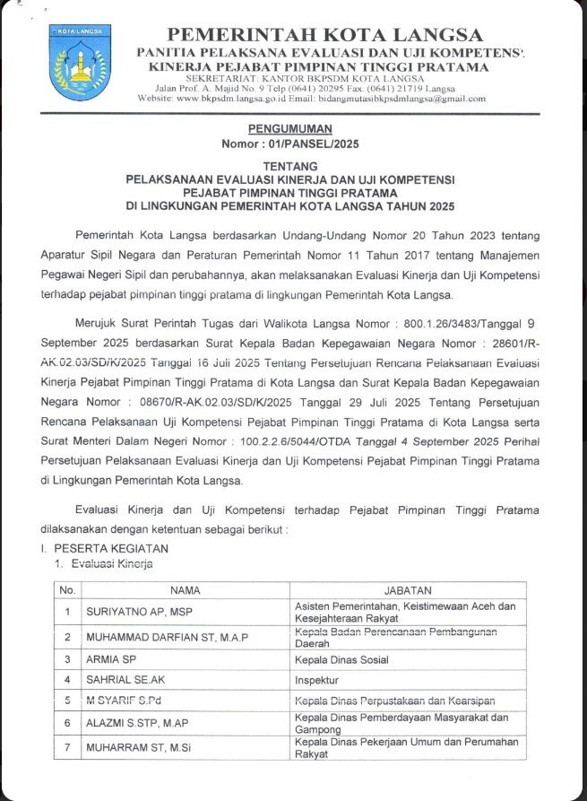 RajaNews.Xyz | Kota Langsa – Pemerintah Kota Langsa melalui Badan Kepegawaian dan Pengembangan Sumber Daya Manusia (BKPSDM) resmi mengumumkan pelaksanaan evaluasi kinerja dan uji kompetensi bagi pejabat pimpinan tinggi (eselon II) di lingkungan Pemerintah Kota Langsa, Kamis, (11/09/2025)