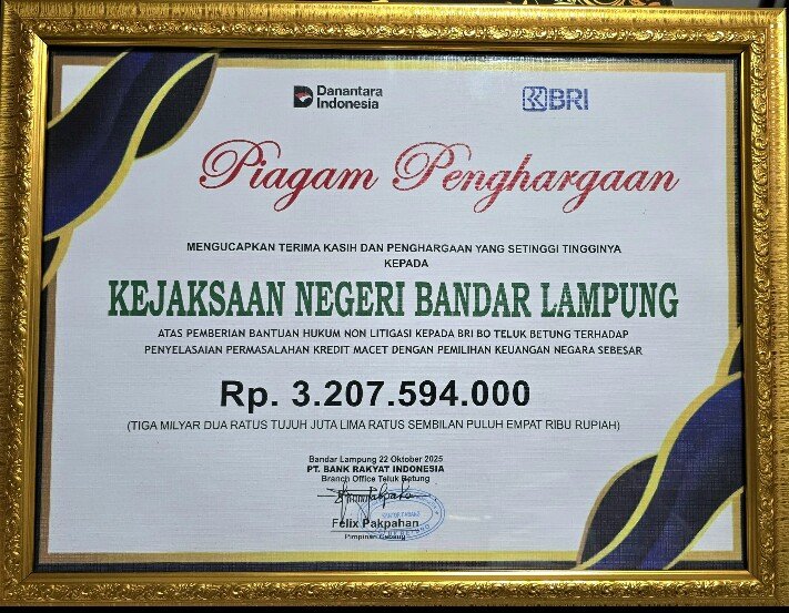 Dalam kesempatan tersebut, PT BRI Branch Office Teluk Betung memberikan apresiasi dan piagam penghargaan kepada Bidang Datun Kejari Bandar Lampung di bawah komando Kajari Baharuddin, S.H, M.H melalui Kasi Datun, Bambang Irawan, S.H, M.H atas kerjasama yang dilakukan berupa bantuan hukum non litigasi dengan surat kuasa khusus (SKK) penanganan kredit macet pada nasabah PT BRI Branch Office Teluk Betung, dan JPN Kejari Bandar Lampung berhasil memulihkan keuangan negara sebesar Rp.3.207.594.000, – (tiga milyar dua ratus tujuh juta lima ratus sembilan puluh empat ribu rupiah). Ini merupakan pemulihan tertinggi se-wilayah Kejati Lampung dalam penanganan kredit macet sektor Perbankan.