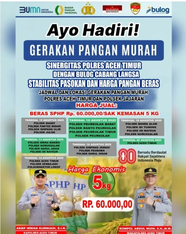 RajaNews.Xyz | ACEH TIMUR – Kepolisian Resor (Polres) Aceh Timur, Polda Aceh, bekerja sama dengan Bulog Cabang Langsa menggelar Gerakan Pangan Murah (GPM) di 21 Kecamatan dalam wilayah hukum Polres Aceh Timur mulai tanggal 12 hingga 20 Agustus 2025.