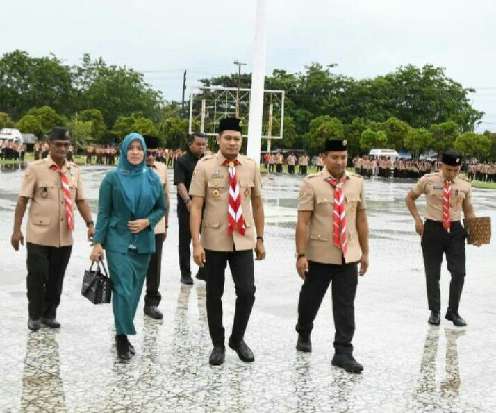 Tanpa ragu, Ny. Erni Handayani menyusul turun ke lapangan, berdiri di samping suaminya, ikut merasakan dinginnya hujan yang mengguyur tubuh mereka. Ia tidak peduli pakaian yang basah atau riasan yang luntur, karena baginya, kebersamaan adalah bentuk kasih sayang yang paling tulus. Ia berdiri tegak, memberikan senyum terbaiknya kepada para peserta jambore, seakan ingin mengatakan bahwa pengabdian tidak boleh berhenti hanya karena cuaca.