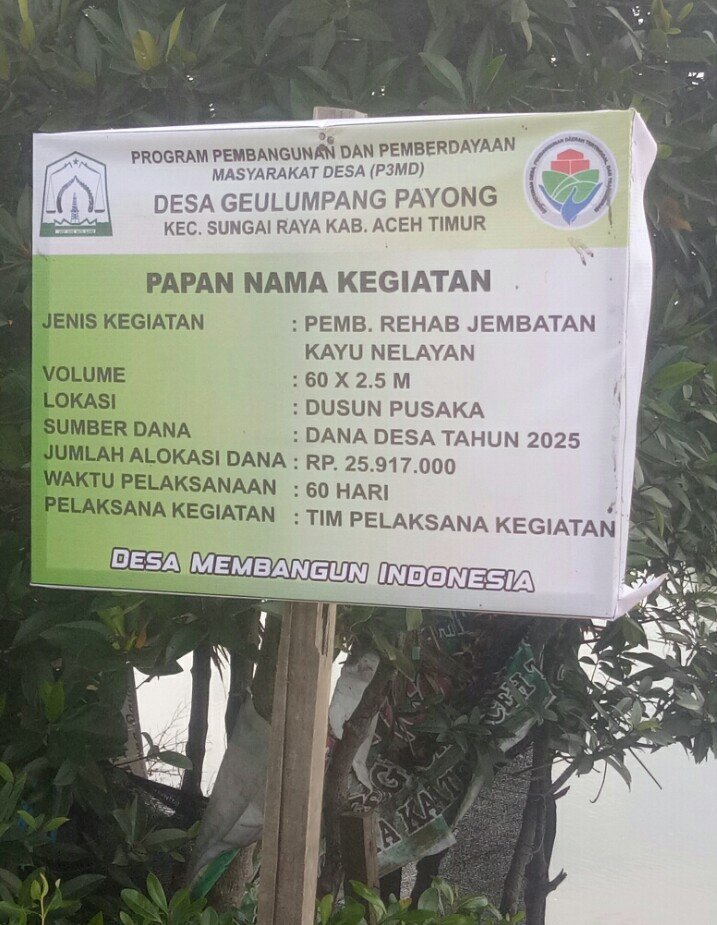 RajaNews.Xyz | Aceh Timur – Program Pembangunan dan Pemberdayaan Masyarakat Desa (P3MD) dengan pembangunan rehab jembatan kayu nelayan di Dusun Pusaka, Gampong, Geulumpang Payong, Kecamatan, Sungai Raya, Kabupaten Aceh Timur dilaksanakan Pada Rabu, (18 Juni 2025),