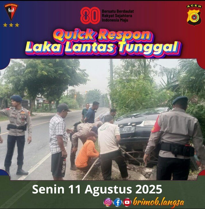 RajaNews.Xyz | ACEH TIMUR – Personel Brimob dari Kompi 2 Batalyon Pelopor Satbrimob Polda Aceh dengan sigap dan cepat menuju lokasi kecelakaan dan langsung membantu mengevakuasi korban kecelakaan tunggal kendaraan pickup jenis Carry yang mengangkut sayur-sayuran, dikendarai oleh Bapak Zulkarnaini warga Kec. Sungai Raya, Kab. Aceh Timur, Senin (11/08/2025).