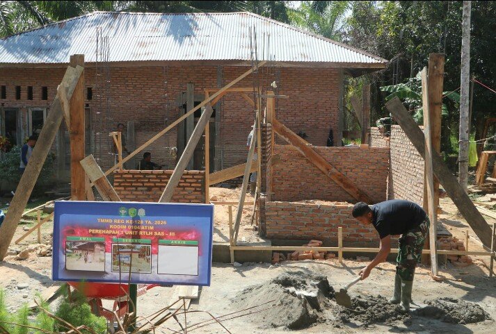 RAJANEWS.Xyz | Aceh Timur – Personel Satgas TNI Manunggal Membangun Desa (TMMD) Reguler ke-128 Kodim 0104/Aceh Timur terus menunjukkan progres pengerjaan di lokasi sasaran fisik. Kali ini, pembangunan Rumah Tidak Layak Huni (RTLH) milik Ibu Cut Farida memasuki tahap pemasangan kusen pintu di Desa Alue Canang, Kecamatan Birem Bayeun, Kabupaten Aceh Timur, Senin (27/04/2026).