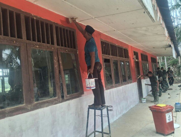 Dengan penuh semangat dan kekompakan, personel Satgas TMMD bersama warga bergotong royong mengecat dinding bangunan sehingga tampak lebih rapi, bersih, dan nyaman digunakan sebagai tempat belajar anak-anak.