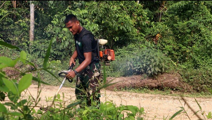 Sejak pagi hari, personel Satgas TMMD tampak bahu-membahu membersihkan areal lahan dari semak belukar, rumput liar, dan berbagai hambatan lainnya agar siap diolah menjadi lahan pertanian yang produktif.