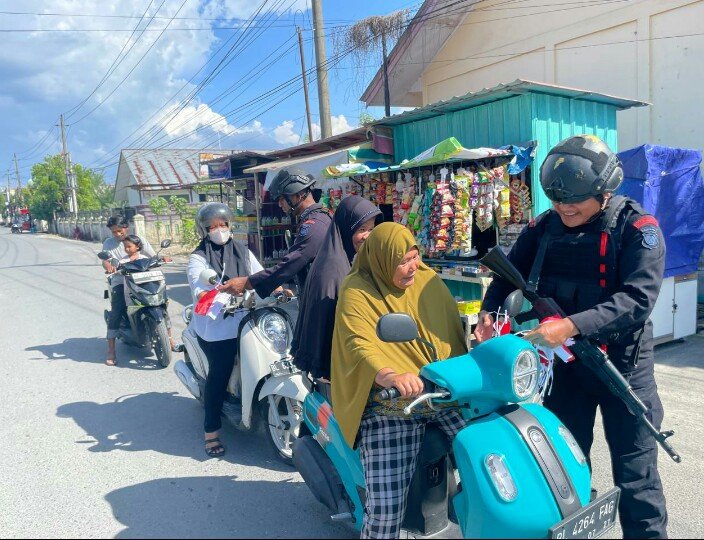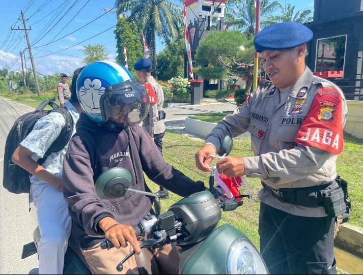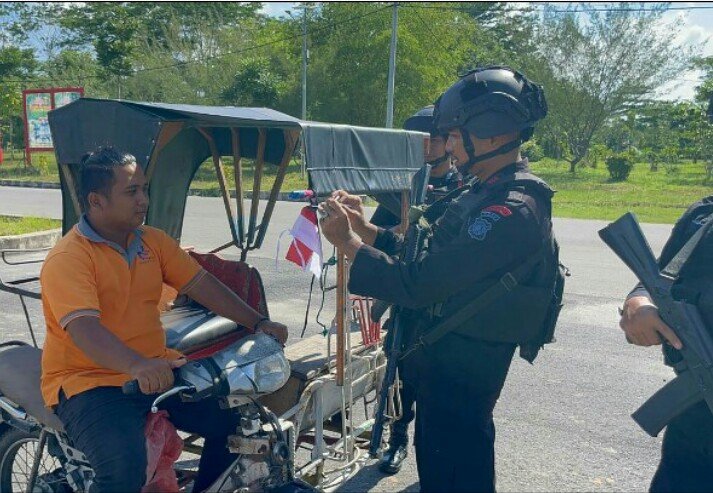 Satuan Brimob Polda Aceh, hari Sabtu (02/08/2025), Menjelang Hari Ulang Tahun ke-80 Kemerdekaan Republik Indonesia dengan mengadakan aksi pembagian Bendera Merah Putih. Kegiatan ini dilakukan oleh Personel Kompi 2 Batalyon B Pelopor Satbrimob Polda Aceh di depan Markas Kompi 2 Batalyon B Pelopor dan jalan umum di Kota Langsa.