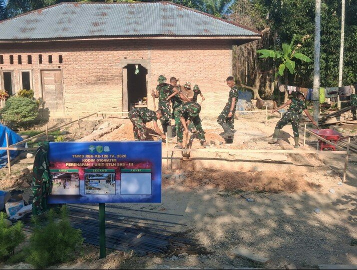 RAJANEWS.Xyz | Aceh Timur – Tak ada kata menunggu. Di hari pertama pelaksanaan TNI Manunggal Membangun Desa (TMMD) Reguler ke-128, Satgas Kodim 0104/Aceh Timur langsung tancap gas mengerjakan sasaran fisik. Salah satunya dengan memulai pekerjaan galian pondasi Rumah Tidak Layak Huni (RTLH) milik Ibu Cut Farida (46) di Desa Alue Canang, Kecamatan Birem Bayeun, Kabupaten Aceh Timur, Rabu (22/04/2026).