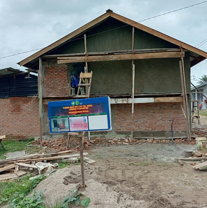 Pasiter Kodim 0104/Atim, Lettu Kav. M. Irwan, turut hadir di lokasi untuk meninjau progres pembangunan. Ia menyampaikan bahwa pengerjaan plesterisasi ini merupakan tahapan penting sebelum masuk ke tahap penyelesaian akhir.