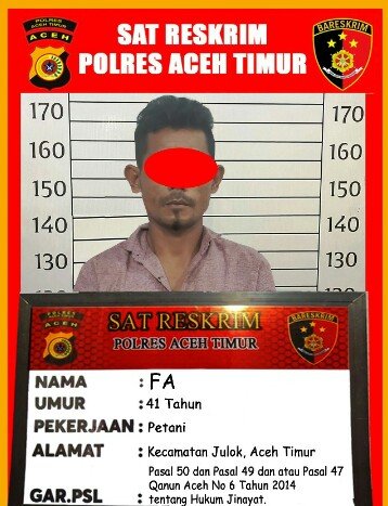 RajaNews.Xyz | ACEH TIMUR – Tim Opsnal Satreskrim Polres Aceh Timur, Polda Aceh pada, Jum’at, (11/07/2025) berhasil mengamankan seorang pria berinisial FA (41), warga Kecamatan Julok, Kabupaten Aceh Timur atas dugaan melanggar Pasal 50 dan atau Pasal 49 dan atau Pasal 47 Qanun Aceh Nomor 6 Tahun 2014 Tentang Hukum Jinayat terhadap anak kandungnya yang berumur 14 tahun.