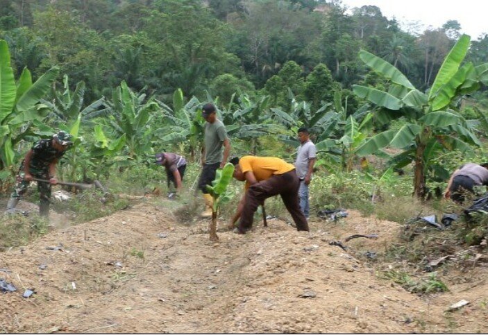 Personel Satgas TMMD bersama Babinsa setempat Sertu Amin dan masyarakat binaan melaksanakan pembersihan areal pertanian seluas 1 hektare yang menjadi salah satu sasaran program ketahanan pangan TMMD.