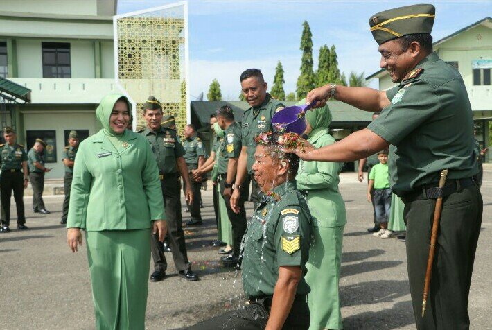 Usai pelaksanaan upacara, kegiatan dilanjutkan dengan tradisi mandi air bunga kepada seluruh prajurit yang naik pangkat. Tradisi ini menjadi simbol penyucian diri dan awal lembaran baru dalam perjalanan karier mereka. Menariknya, momen ini juga semakin berkesan karena para prajurit didampingi langsung oleh istrinya masing-masing, sebagai bentuk dukungan moral dari keluarga yang turut menjadi bagian dari perjuangan mereka.