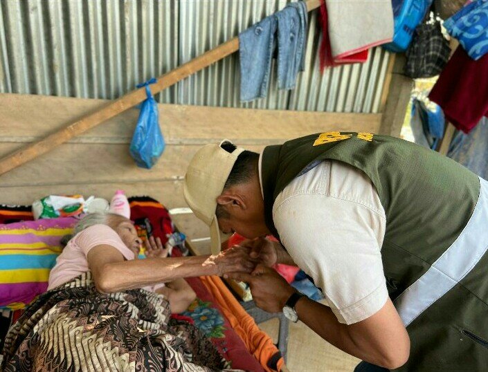 Di tengah kunjungan itu, ia juga menyempatkan diri menjenguk warga yang jatuh sakit akibat cuaca dan tekanan psikologis. Suasana hening saat ia duduk bersimpuh di sisi seorang lansia yang terbaring lemah.