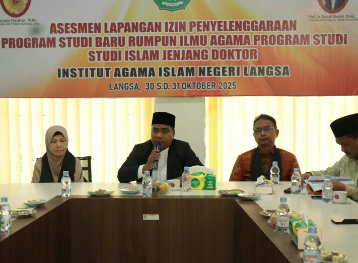 RAJANEWS.Xyz | KOTA LANGSA – Wakil Rektor I Bidang Akademik dan Pengembangan Kelembagaan Institut Agama Islam Negeri (IAIN) Langsa, Dr. Amiruddin Yahya Azzawiy, MA yang akrab disapa Dr.Emi menyambut kehadiran Asesor Kementerian Agama Republik Indonesia (Kemenag RI) dalam kegiatan Asesmen Lapangan (AL) Izin Penyelenggaraan Program Studi Doktor (S3) Studi Islam pada Pascasarjana IAIN Langsa, Jum’at (31/10/2025).
