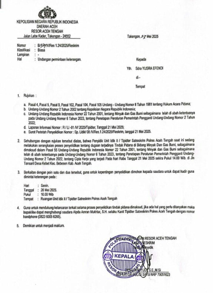 Kepolisian Resor (Polres) Aceh Tengah melalui Satuan Reserse Kriminal (Satreskrim) resmi melayangkan surat undangan kepada Yusra Efendi untuk hadir dan memberikan keterangan dalam penyelidikan dugaan tindak pidana di bidang minyak dan gas bumi (migas), Sabtu, 23 Mei 2025.